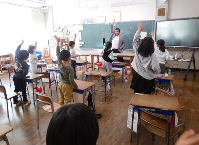 12月19日(金)朝からALTさんが来てくださり、1~4年生に英語を身振り手振りで教えてくださいました。笑い声の絶えない楽しい時間をつくっていただきました。