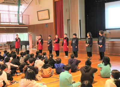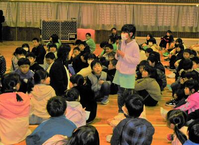 としょ坊さん「おはなしの会」 投稿: 和田小教職員 (10/30) 10月30日(木)中間タイムに全校生が集まり、としょ坊さんによる「お話の会」を開催しました。雰囲気は、劇場のようで、スクリーンに本を映し出し、2冊の絵本をとしょ坊の民さんが、本の中の役割を演じて読んでくださいました。感想発表では、たくさんの手が挙がり、本への愛着と興味がとしょ坊さんのおかげで、さらに増した会となりました。 Tweet -